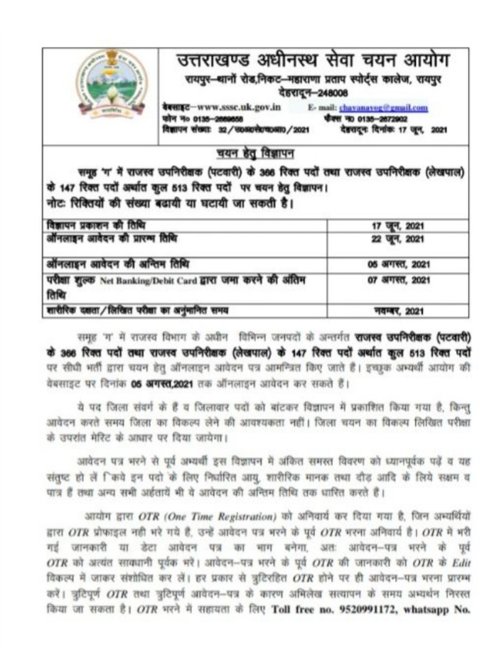 उत्तराखंड अधीनस्थ सेवा चयन आयोग(UKSSSC) ने लेखपाल और पटवारी के पदों पर भर्तियां निकाली हैं! नोटिफिकेशन के अनुसार कुल 513 पद रिक्त हैं! जिसमें से 366 पद पटवारी और 147 पद लेखपाल के हैं! इसके लिए आवेदन प्रक्रिया 22 जून 2021 से शुरू होकर 5 अगस्त 2021 तक चलेगी! सरकारी नौकरी के इच्छुक युवा उत्तराखंड एसएसएससी की वेबसाइट sssc.uk.gov.in पर जाकर आवेदन कर सकेंगे! नोटिफिकेशन के अनुसार पटवारी और अकाउंटेंट पदों के लिए फिजिकल टेस्ट भी होगा! पुरुष अभ्यर्थियों को 1 घंटे में 7 किलोमीटर और महिला अभ्यर्थियों को 35 मिनट में 3.7 किलोमीटर दौड़ना होगा! वही अकाउंटेंट पद के लिए पुरुष अभ्यर्थियों को 1 घंटे में 9 किलोमीटर और महिला अभ्यर्थियों को 35 मिनट में 4.5 किलोमीटर दौड़ना होगा! इसके साथ शारीरिक मापदंड भी तय किया गया है! पटवारी पद के लिए पुरुष अभ्यर्थियों की लंबाई 168 सेंटीमीटर और महिला अभ्यर्थियों के लिए 152 सेंटीमीटर अनिवार्य है! हालांकि पर्वतीय मूल के अभ्यर्थियों को अधिकतम लंबाई में 5 सेंटीमीटर की छूट मिलेगी! पुरुष अभ्यर्थियों का सीना फुलाव के साथ 84 सेंटीमीटर होना चाहिए! इसमें अभ्यर्थी के सीने में कौन सी मटर का फुलाव अनिवार्य है! पर्वतीय मूल के अभ्यर्थियों को इसमें भी छूट मिलेगी ,महिला अभ्यर्थियों का वजन 45 किलोग्राम कम से कम होना चाहिए!