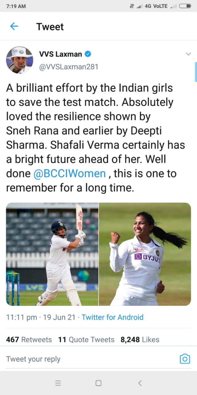 स्नेहा की इस पारी की वीवीएस लक्ष्मण ओर विरेंद्र सहवाग ने तारीफ की ,